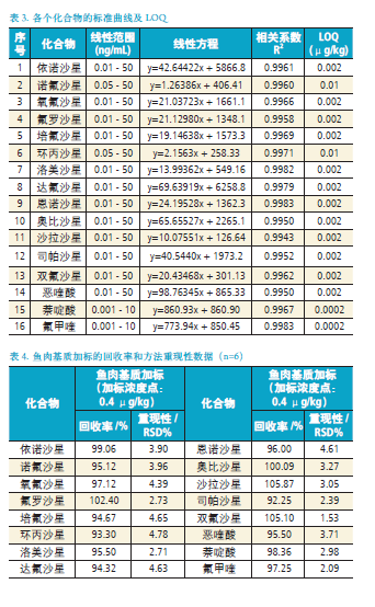 其余喹諾酮目標(biāo)化合物的標(biāo)準(zhǔn)曲線在0.01-50 ng/mL,依次為0.01,0.02,0.05,0.1,0.2,0.5,1.0,2.0,5.0,10.0,20.0,50.0 ng/mL。其中,諾氟沙星和環(huán)丙沙星為0.05-50 ng/mL,萘啶酸和氟甲喹為0.001-10 ng/mL。標(biāo)準(zhǔn)曲線范圍內(nèi)具有良好的線性(R2> 0.994);采用魚肉基質(zhì)作為加標(biāo)樣品,平行6 個樣品測試方法的回收率和方法重現(xiàn)性,詳細結(jié)果請見表4。從表4 可以看到,在加標(biāo)濃度為2 ng/mL 下,回收率為92.25-105.87 %,方法重現(xiàn)性為1.53-4.78%。最低定量限為0.0002-0.01μg/kg,完全符合殘留檢測要求。