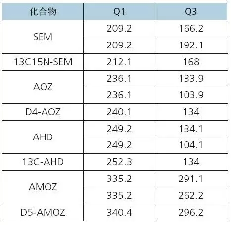 通常建立液質(zhì)聯(lián)用(LC-MS/MS)方法時(shí)需要使用標(biāo)準(zhǔn)品進(jìn)行MRM質(zhì)譜方法優(yōu)化,包括母離子、子離子以及相應(yīng)的電壓參數(shù),費(fèi)錢(qián)、費(fèi)時(shí)、費(fèi)力。本方法針對(duì)農(nóng)業(yè)部783號(hào)公告-1-2006中硝基呋喃代謝物及其內(nèi)標(biāo),建立了MRM離子對(duì)信息、質(zhì)譜參數(shù)、液相條件,省去了優(yōu)化步驟,可直接用于水產(chǎn)品中硝基呋喃代謝物殘留量的測(cè)定。