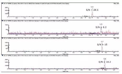 上述方法可完全適用于農(nóng)業(yè)部783號(hào)公告-1-2006《水產(chǎn)品中硝基呋喃類(lèi)代謝產(chǎn)物殘留量的測(cè)定液相色譜-串聯(lián)質(zhì)譜法》,該法適合Sciex公司Triple Quad? 3200系列、3500系列、4000系列、4500系列、API 5000、5500系列以及6500系列的LC-MS/MS系統(tǒng)。靈敏度高,重現(xiàn)性好,適用于各相關(guān)實(shí)驗(yàn)室進(jìn)行該類(lèi)物質(zhì)的日常分析。
