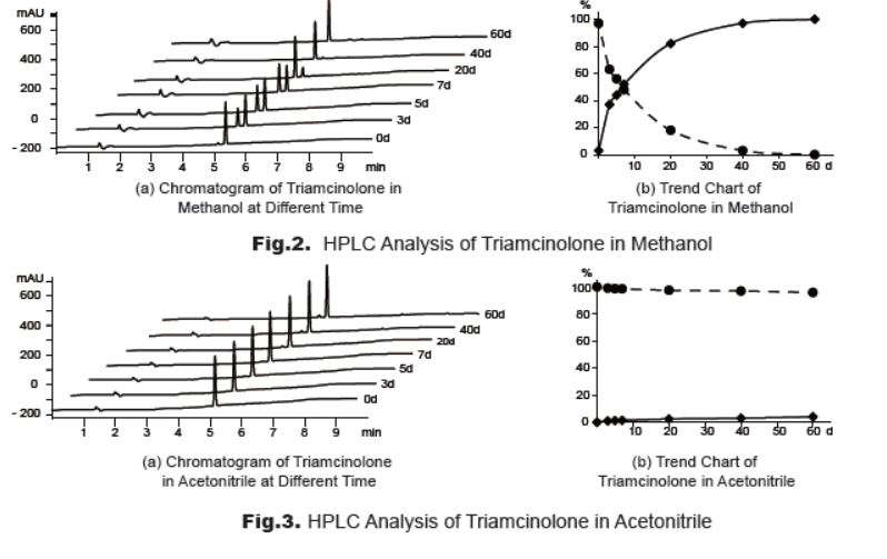 To study the stability, a solution of triamcinolone in methanol or acetonitrile was prepared individually. The solutions were stored at 2-8°C and analyzed (Fig.2, Fig.3). The results clearly reveal that triamcinolone is not stable in methanol and it’s relatively stable in acetonitrile solution. Therefore, it’s suggested to use triamcinolone solution in acetonitrile rather than methanol for analysis and store the solution at -20oC or lower, or use freshly prepared solution.
